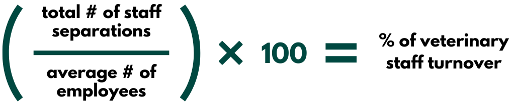 For example, if a practice has 30 staff members on average (between a practice manager, veterinarians, veterinary technicians, a receptionist, kennel aids, and groomers) and experienced 10 separations in the past year, then this practice experienced an annual veterinary team turnover of 33%.