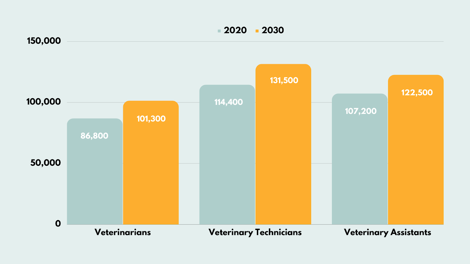 - For veterinary assistants, a growth rate of 14%, with 15,300 new positions by 2030