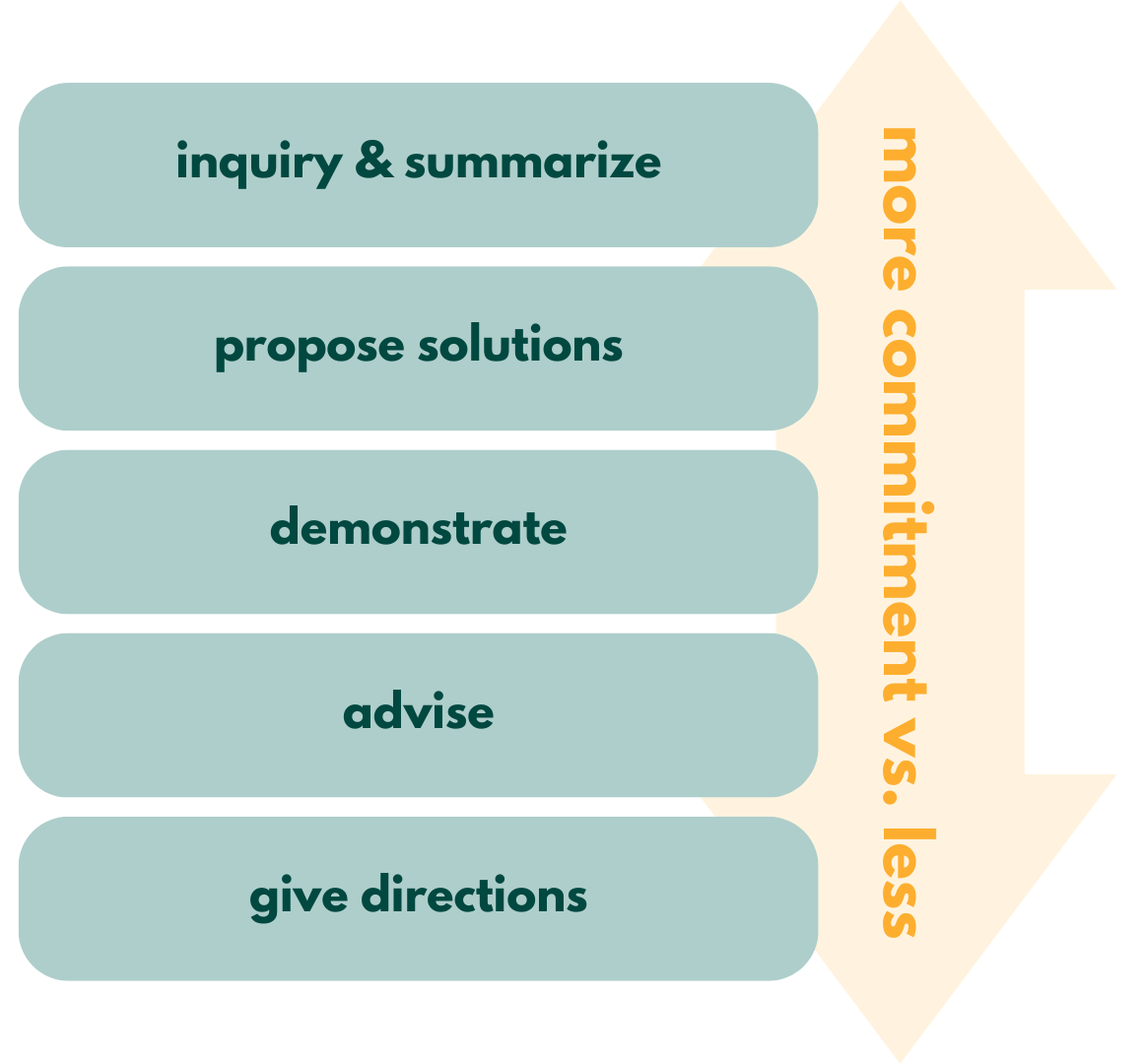 The Coaching Commitment Continuum (below) from Jeff Thoren’s adaptation of Max Landsberg’s conceptualization shows the role of inquiry in establishing and fostering commitment, then turning it into action.