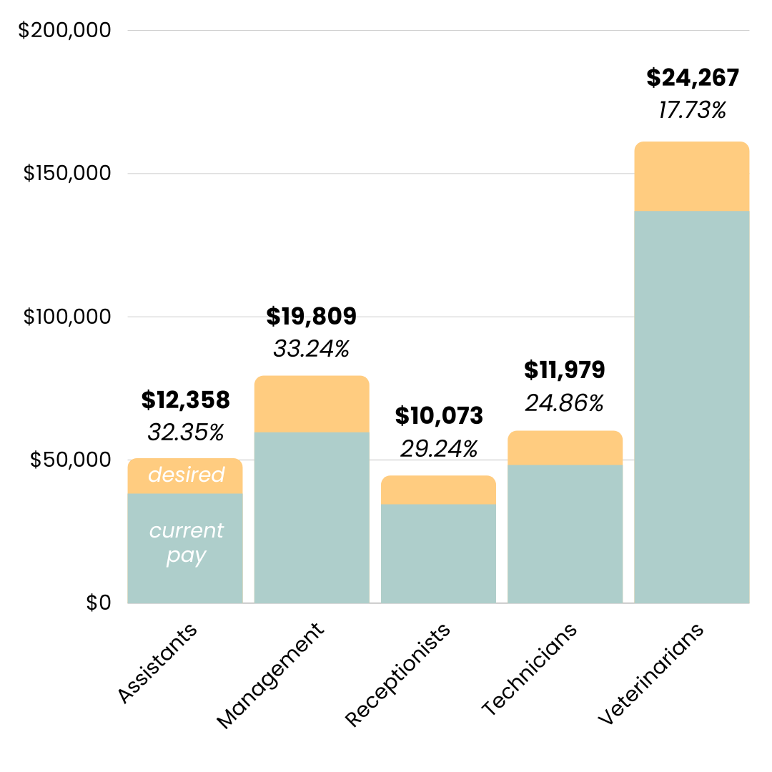 - Across all positions, veterinary professionals feel, on average, they should be paid $15,471 more per year, which equates to an average of a 27.5% increase in annual pay.